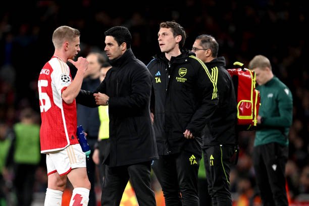 LONDON, ENGLAND – APRIL 09: Mikel Arteta, Manager of Arsenal, talks with Oleksandr Zinchenko of Arsenal during the UEFA Champions League quarter-final first leg match between Arsenal FC and FC Bayern München at Emirates Stadium on April 09, 2024 in London, England. (Photo by Stuart MacFarlane/Arsenal FC via Getty Images)
