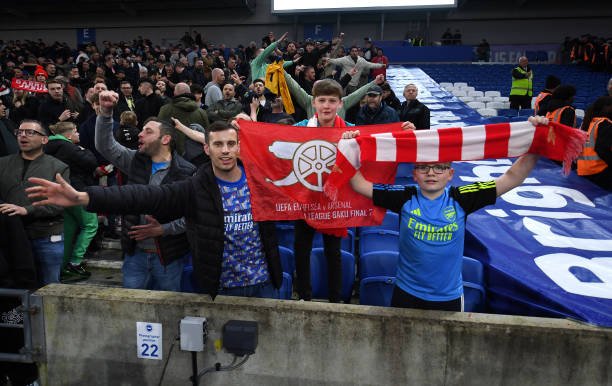 BRIGHTON, ENGLAND - APRIL 06: Arsenal fans show their support during the Premier League match between Brighton & Hove Albion and Arsenal FC at American Express Community Stadium on April 06, 2024 in Brighton, England. (Photo by Stuart MacFarlane/Arsenal FC via Getty Images)