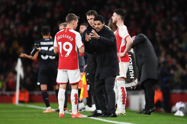 LONDON, ENGLAND - APRIL 03: Mikel Arteta, Manager of Arsenal, speaks with his player, Leandro Trossard during the Premier League match between Arsenal FC and Luton Town at Emirates Stadium on April 03, 2024 in London, England. (Photo by Stuart MacFarlane/Arsenal FC via Getty Images)