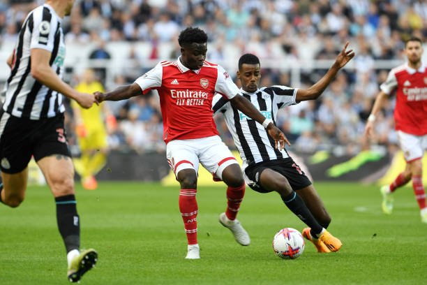 NEWCASTLE UPON TYNE, ENGLAND – MAY 07: Bukayo Saka of Arsenal is challenged by Alexander Isak of Newcastle United during the Premier League match between Newcastle United and Arsenal FC at St. James Park on May 07, 2023 in Newcastle upon Tyne, England. (Photo by Stuart MacFarlane/Arsenal FC via Getty Images)