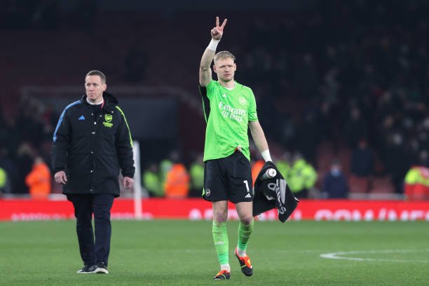 LONDON, ENGLAND – MARCH 9: Arsenal goalkeeper Aaron Ramsdale reacts to the supporters after the Premier League match between Arsenal FC and Brentford FC at Emirates Stadium on March 9, 2024 in London, England.(Photo by Mark Leech/Offside/Offside via Getty Images)