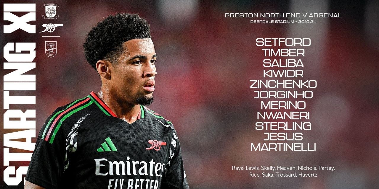 Arsenal is set to face Preston North End in the EFL Cup Round of 16, with the match set to kick off in a few minutes. Mikel Arteta has announced a strong starting lineup, blending experience with youth to navigate this away fixture at Deepdale Stadium.