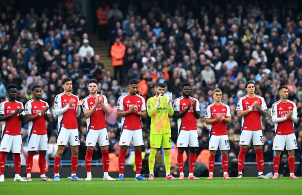 MANCHESTER, ENGLAND - SEPTEMBER 22: Players of Arsenal line up prior to ring the Premier League match between Manchester City FC and Arsenal FC at Etihad Stadium on September 22, 2024 in Manchester, England. (Photo by Stuart MacFarlane/Arsenal FC via Getty Images)