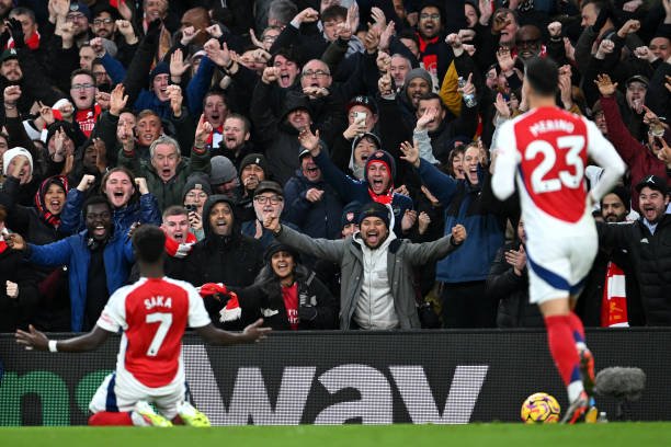 LONDON, ENGLAND - NOVEMBER 23: Arsenal fans celebrate after Bukayo Saka of Arsenal scores his team's first goal during the Premier League match between Arsenal FC and Nottingham Forest FC at Emirates Stadium on November 23, 2024 in London, England. (Photo by Stuart MacFarlane/Arsenal FC via Getty Images)