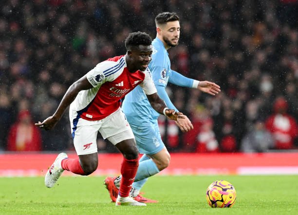 LONDON, ENGLAND - NOVEMBER 23: Bukayo Saka of Arsenal looks for the ball whilst under pressure from Alex Moreno of Nottingham Forest during the Premier League match between Arsenal FC and Nottingham Forest FC at Emirates Stadium on November 23, 2024 in London, England. (Photo by Stuart MacFarlane/Arsenal FC via Getty Images)