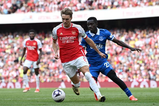 LONDON, ENGLAND - MAY 19: Martin Odegaard of Arsenal is challenged by Idrissa Gueye of Everton during the Premier League match between Arsenal FC and Everton FC at Emirates Stadium on May 19, 2024 in London, England. (Photo by Stuart MacFarlane/Arsenal FC via Getty Images)