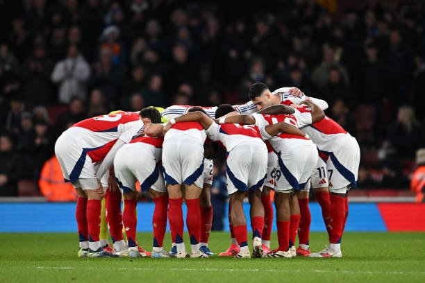 LONDON, ENGLAND - DECEMBER 14: Players of Arsenal huddle after half-time during the Premier League match between Arsenal FC and Everton FC at Emirates Stadium on December 14, 2024 in London, England. (Photo by Stuart MacFarlane/Arsenal FC via Getty Images)