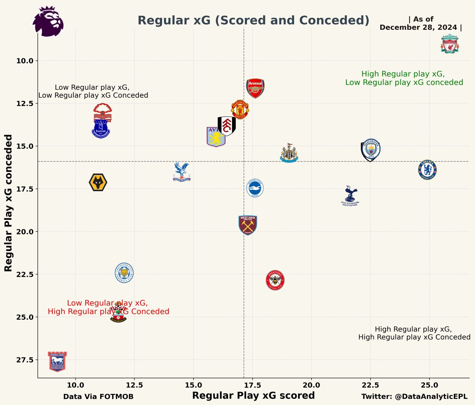 Tottenham Hotspur, despite generating a high xG scored, sit further down the table due to their defensive frailties, as reflected by their higher xG conceded.