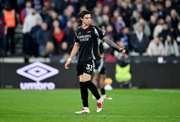 LONDON, ENGLAND – NOVEMBER 30: Riccardo Calafiori of Arsenal gestures a thumbs up as he leaves the field whilst being substituted during the Premier League match between West Ham United FC and Arsenal FC at London Stadium on November 30, 2024 in London, England. (Photo by Stuart MacFarlane/Arsenal FC via Getty Images)