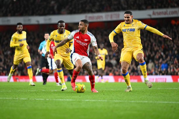 LONDON, ENGLAND - DECEMBER 18: Gabriel Jesus of Arsenal controls the ball whilst under pressure from Maxence Lacroix of Crystal Palace during the Carabao Cup Quarter Final match between Arsenal and Crystal Palace at Emirates Stadium on December 18, 2024 in London, England. (Photo by Stuart MacFarlane/Arsenal FC via Getty Images)