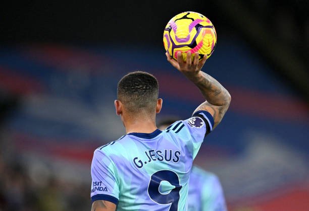 LONDON, ENGLAND - DECEMBER 21: Gabriel Jesus of Arsenal holds up the match ball during the Premier League match between Crystal Palace FC and Arsenal FC at Selhurst Park on December 21, 2024 in London, England. (Photo by Stuart MacFarlane/Arsenal FC via Getty Images)