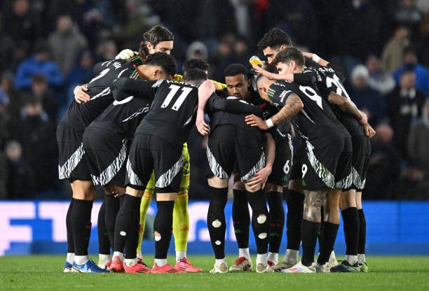 BRIGHTON, ENGLAND - JANUARY 04: Players of Arsenal form a huddle before the second half during the Premier League match between Brighton & Hove Albion FC and Arsenal FC at Amex Stadium on January 04, 2025 in Brighton, England. (Photo by Stuart MacFarlane/Arsenal FC via Getty Images)