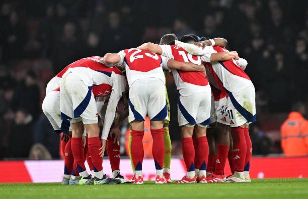 LONDON, ENGLAND - JANUARY 18: Arsenal enter a huddle before the second half during the Premier League match between Arsenal FC and Aston Villa FC at Emirates Stadium on January 18, 2025 in London, England. (Photo by Stuart MacFarlane/Arsenal FC via Getty Images)