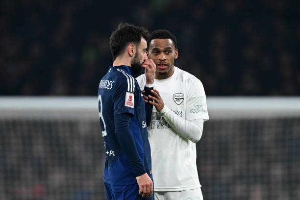 LONDON, ENGLAND – JANUARY 12: Bruno Fernandes of Manchester United interacts with Jurrien Timber of Arsenal during the Emirates FA Cup Third Round match between Arsenal and Manchester United at Emirates Stadium on January 12, 2025 in London, England. Arsenal are playing in a special all-white kit for today’s FA Cup third-round tie as part of their ‘No More Red’ initiative which was launched in collaboration with Adidas in 2022 to keep young people safe from knife crime. (Photo by Stuart MacFarlane/Arsenal FC via Getty Images)