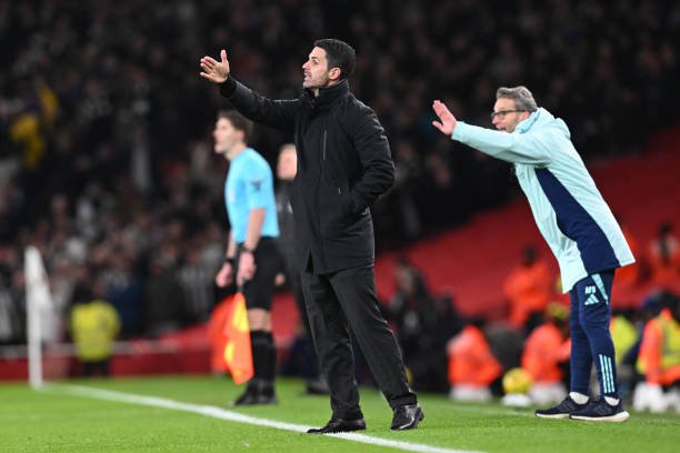 LONDON, ENGLAND - JANUARY 07: Mikel Arteta, Manager of Arsenal, gestures during the Carabao Cup Semi Final First Leg match between Arsenal and Newcastle United at Emirates Stadium on January 07, 2025 in London, England. (Photo by Stuart MacFarlane/Arsenal FC via Getty Images)