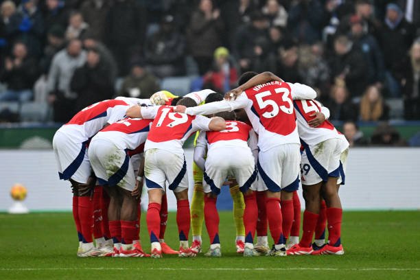 LEICESTER, ENGLAND - FEBRUARY 15: Players of Arsenal huddle prior to the Premier League match between Leicester City FC and Arsenal FC at The King Power Stadium on February 15, 2025 in Leicester, England. (Photo by Stuart MacFarlane/Arsenal FC via Getty Images)