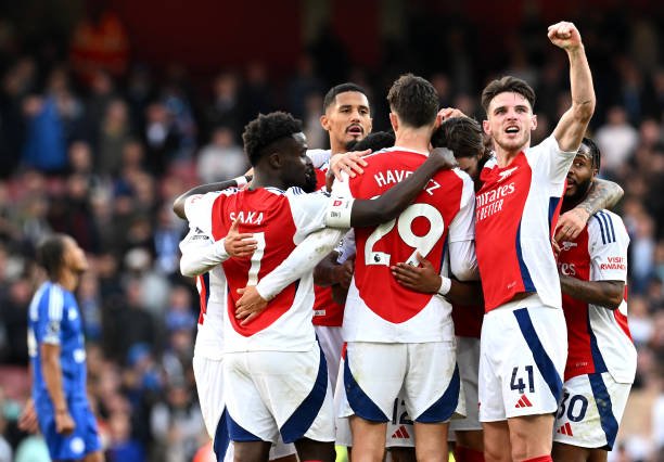 LONDON, ENGLAND - SEPTEMBER 28: Declan Rice of Arsenal celebrates with teammates after teammate Leandro Trossard of Arsenal (obscured) scores his team's third goal during the Premier League match between Arsenal FC and Leicester City FC at Emirates Stadium on September 28, 2024 in London, England. (Photo by Stuart MacFarlane/Arsenal FC via Getty Images)