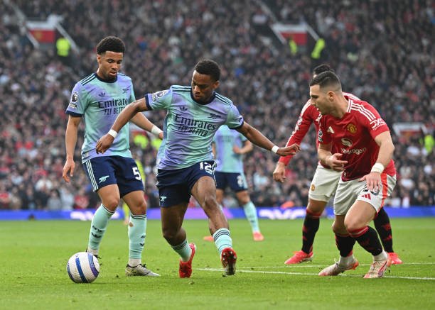 MANCHESTER, ENGLAND - MARCH 09: Ethan Nwaneri and Jurrien Timber of Arsenal is challenged by Diogo Dalot of Manchester United during the Premier League match between Manchester United FC and Arsenal FC at Old Trafford on March 09, 2025 in Manchester, England. (Photo by Stuart MacFarlane/Arsenal FC via Getty Images)