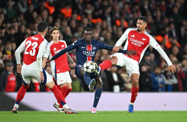 LONDON, ENGLAND - OCTOBER 01: Randal Kolo Muani of Paris Saint-Germain is challenged by William Saliba of Arsenal during the UEFA Champions League 2024/25 League Phase MD2 match between Arsenal FC and Paris Saint-Germain at Emirates Stadium on October 01, 2024 in London, England. (Photo by Stuart MacFarlane/Arsenal FC via Getty Images)