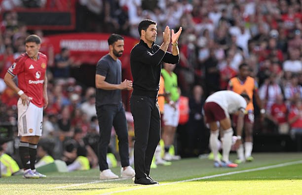 MANCHESTER, ENGLAND - AUGUST 17: Mikel Arteta, Manager of Arsenal reacts during the Premier League match between Manchester United and Arsenal at Old Trafford on August 17, 2025 in Manchester, England. (Photo by Stuart MacFarlane/Arsenal FC via Getty Images)