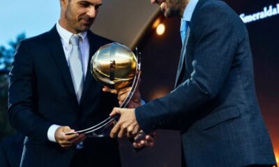 Arsenal’s Mikel Arteta receives a spectacular award for his club’s success
